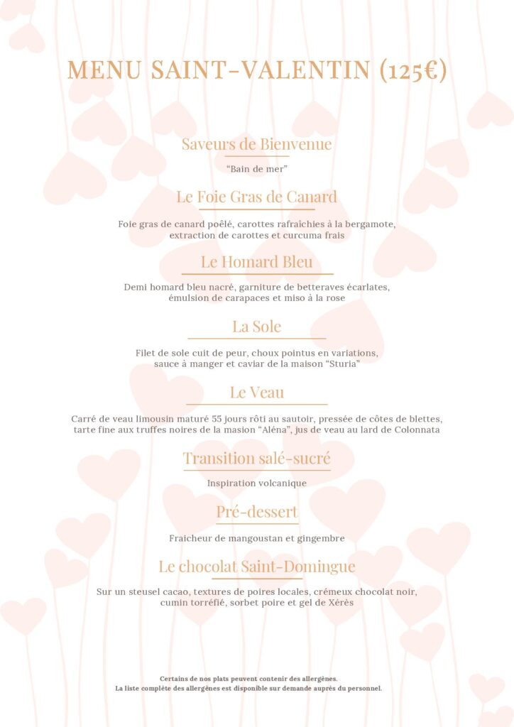 Nous sommes complets le samedi 14 février au soir mais il sera proposé aussi le soir du vendredi 13 ainsi que les midis du samedi 14 et dimanche 15 en complément des menus « Aube des sens » et « Coeurlequin ».